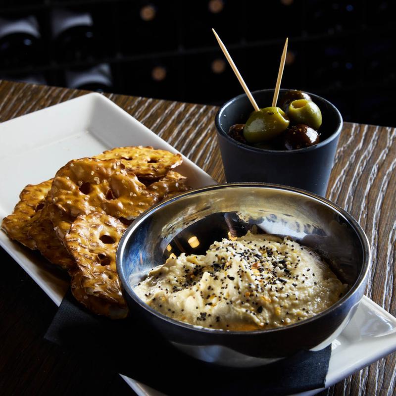 Drizzled with olive oil and Everything Bagel seasoning. Served with olives and pretzel chips.